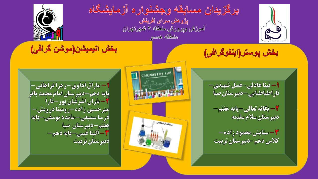 اسامی دانش آموزان پژوهشگر برگزیده یازدهم تجربی صبا در جشنواره و مسابقه علوم آزمایشگاهی - بخش پوستر و انیمیشن - در هفته پژوهش